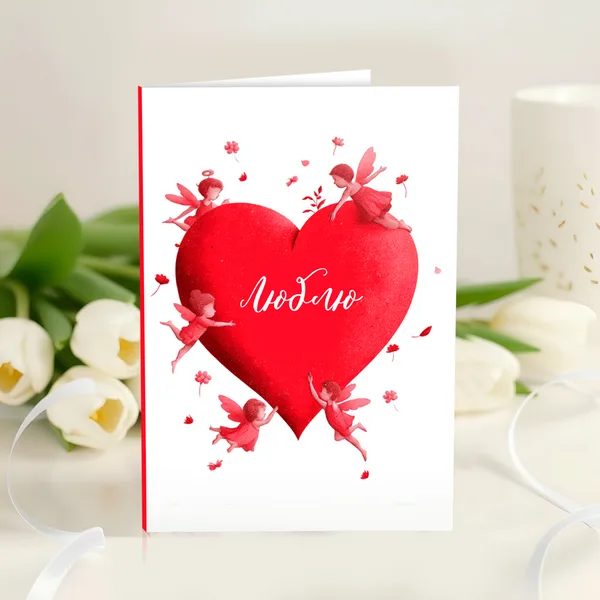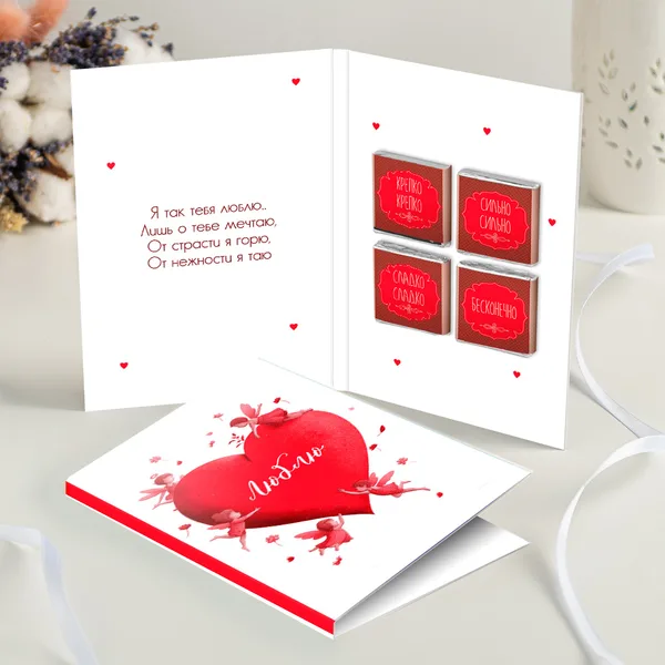 Открытка 4 шоколадки "Люблю (большое сердце с ангелами)"