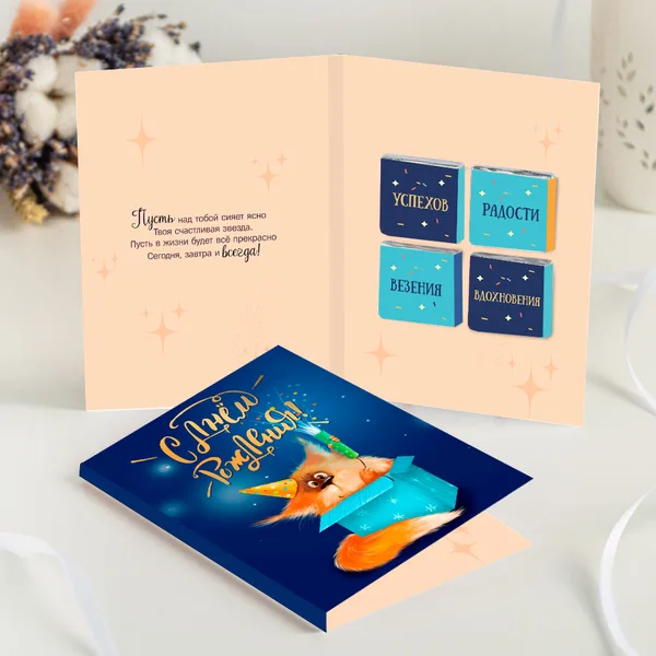 Размер открытки: 10 х 15 х 0,5 см. Внутри открытки - 4 шоколадки (вес каждой шоколадки: 5 г., размер: 31 х 31 мм.) Каждая шоколадка упакована в индивидуальную этикетку с пожеланием. Состав шоколада (37% какао): сахар, какао масло, сухое цельное молоко, какао тертое, эмульгатор соевый лецитин, натуральный ароматизатор ваниль.