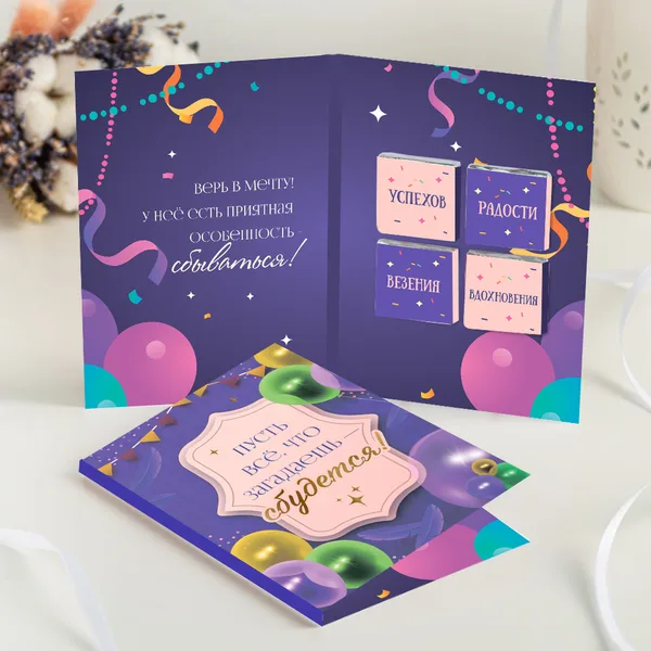 Открытка на 4 шоколадки "Пусть всё, что загадаешь - сбудется!"