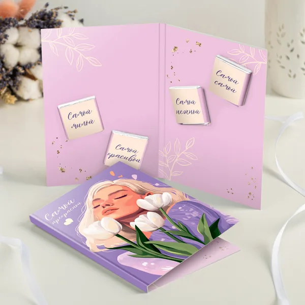 Открытка 4 шоколадки "Самой прекрасной (девушка на фиолетовом фоне)"