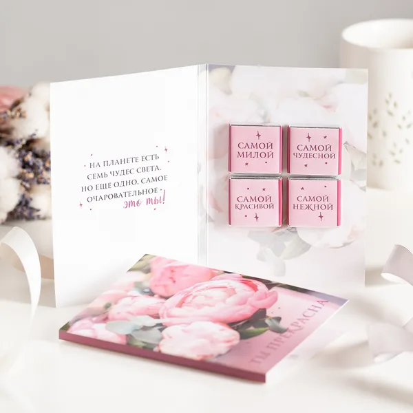 Открытка 4 шоколадки "Ты прекрасна (пионы)"