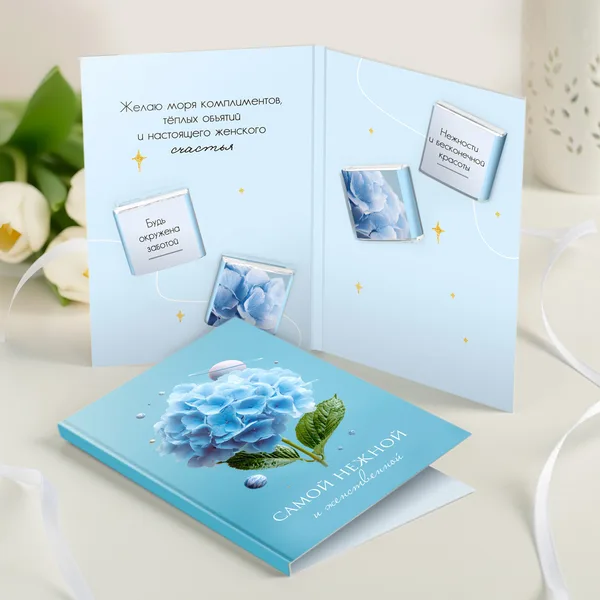 Открытка 4 шоколадки "Самой нежной и женственной (гортензия с планетами)"