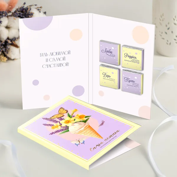 Открытка 4 шоколадки "Самой нежной (цветы в рожке и бабочки)"