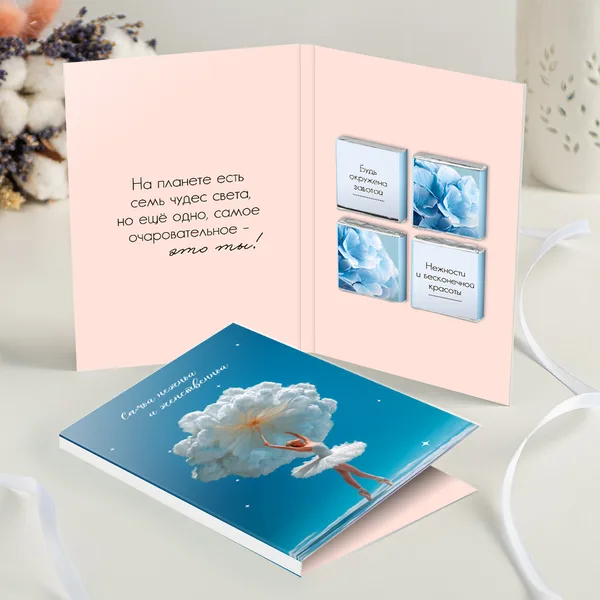 Открытка 4 шоколадки "Самой нежной и женственной (балерина с цветком)"