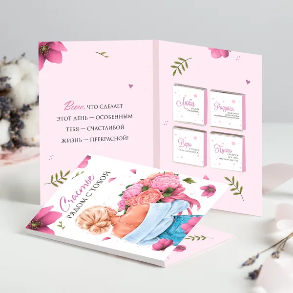 Открытка 4 шоколадки "Счастье рядом с тобой" (девушка с цветами)