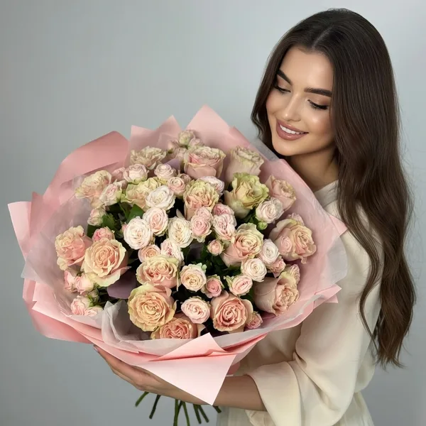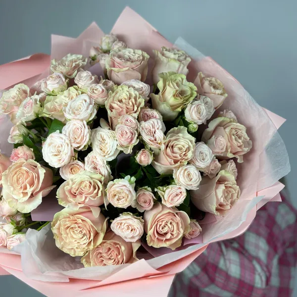 Нежный букет из пионовидных роз в пастельной гамме — от кремово-белого до мягкого персиково-розового. Лёгкие оттенки переходят один в другой, создавая воздушное, почти акварельное настроение. Букет обёрнут в тонкую розовую бумагу и выглядит невероятно женственно и изысканно.»
