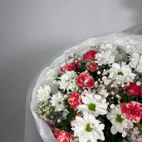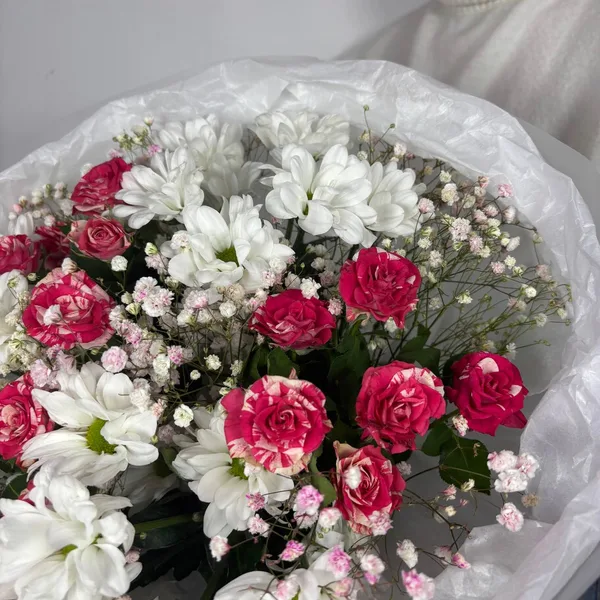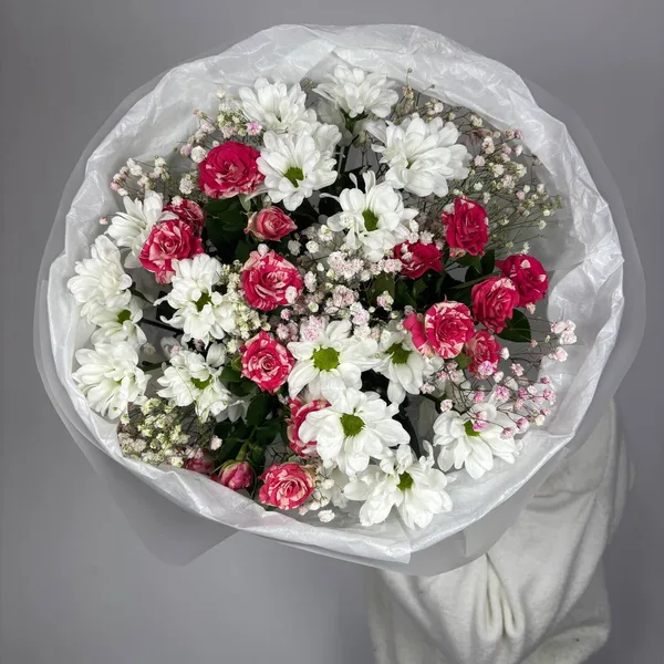 Нежный и воздушный букет в бело-розовой гамме. Крупные белые хризантемы и яркие малиново-розовые розы создают идеальный контраст, а лёгкое облако гипсофилы добавляет букету невесомость и романтику. Отличный выбор для признания в чувствах или чтобы просто подарить улыбку.